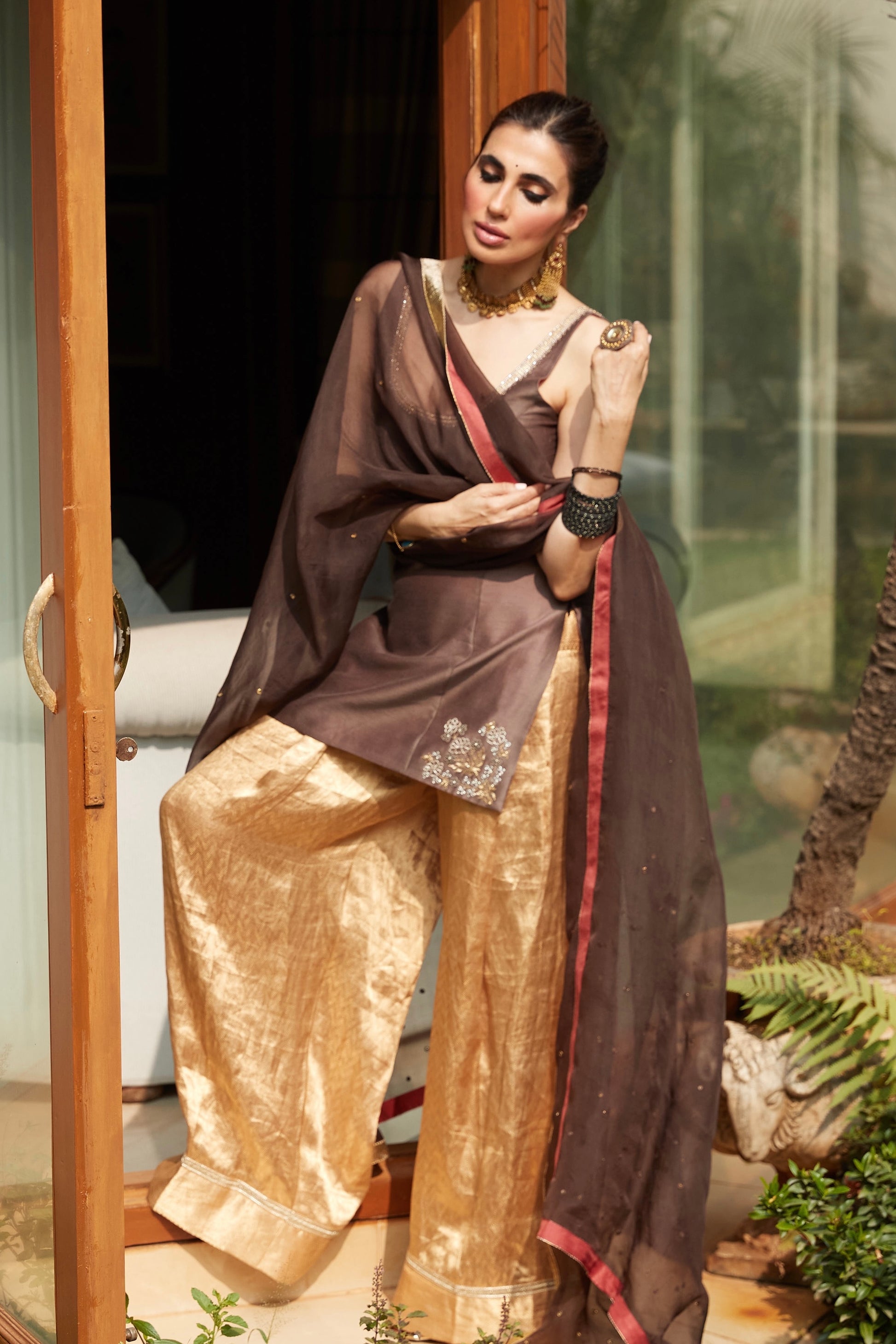 Colour details : Kurta - Cocoa | Salwar - Gold | Dupatta - Cocoa